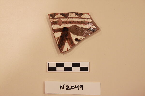 - Medium: Earthenware; white slipped, slip-painted in dark brown under a colorless glaze