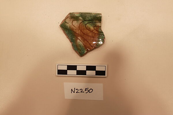 - Medium: Earthenware; white slipped, splashed and incised under a colorless glaze.
