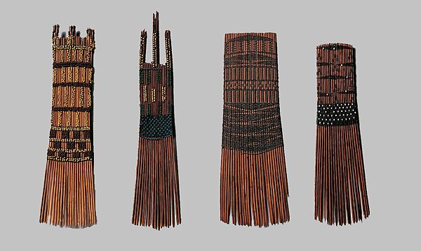 Throughout Polynesia, the head is understood to be the seat of an individual’s spiritual power (mana) and a potent site that connects the body with the ancestors. Made from the stems of the coconut leaflet, these comb-like ornaments were used to adorn the head and hair. Neatly tied together with fine strands of coconut fiber, they display intricate designs that are skillfully executed with finely plaited fiber and imported glass beads.