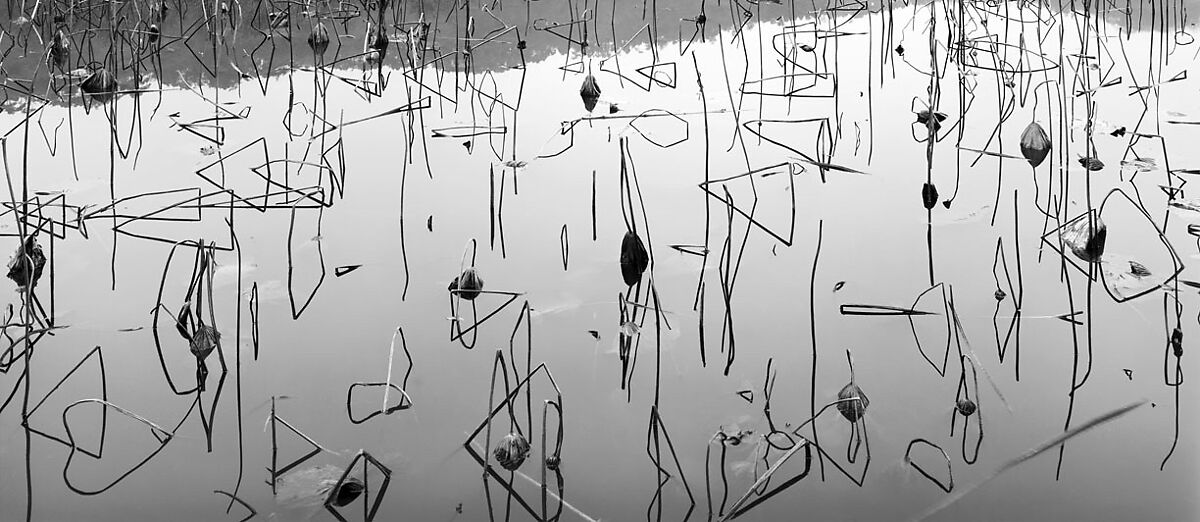 This image of dried lotus stalks and their mirrored reflections in a tranquil pond blends naturalism and abstraction in a manner often seen in traditional Chinese flower paintings. Without the narrow stretch of reflected landscape along the upper edge, the strong linearity of the imagery against the “blank” surface of the water could readily make the work resemble a piece of calligraphy. The geometric shapes serendipitously created by the reflections enrich the composition with a modernist flair.
