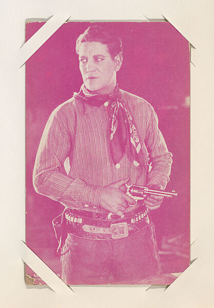 From Western Stars or Scenes Exhibit Cards series (W412). Distributed by Exhibit Supply Company of Chicago, Mutoscope or other companies. Postcard-sized thick card. Postcard back. Dispensed in arcade machines. Color toned.