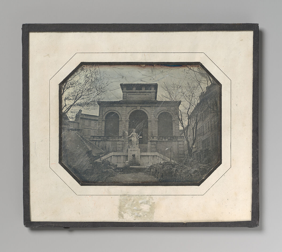 Although difficult to date with certainty, this view of the Halle des Capucins (now the metro and tramway station, Gare de Noailles, in Marseille) was likely made within several years of the building’s completion in 1837 by the city’s architect, Frédéric Chassériau. The picture shows the remnants of the city’s bustling nineteenth-century flower market, held at the feet of Joseph Chinard’s La Paix (1810), a colossal figure personifying peace. The statue was conserved and cleaned in 2018 as part of a revitalization project of the area, which is still famous for its produce and food stands.
