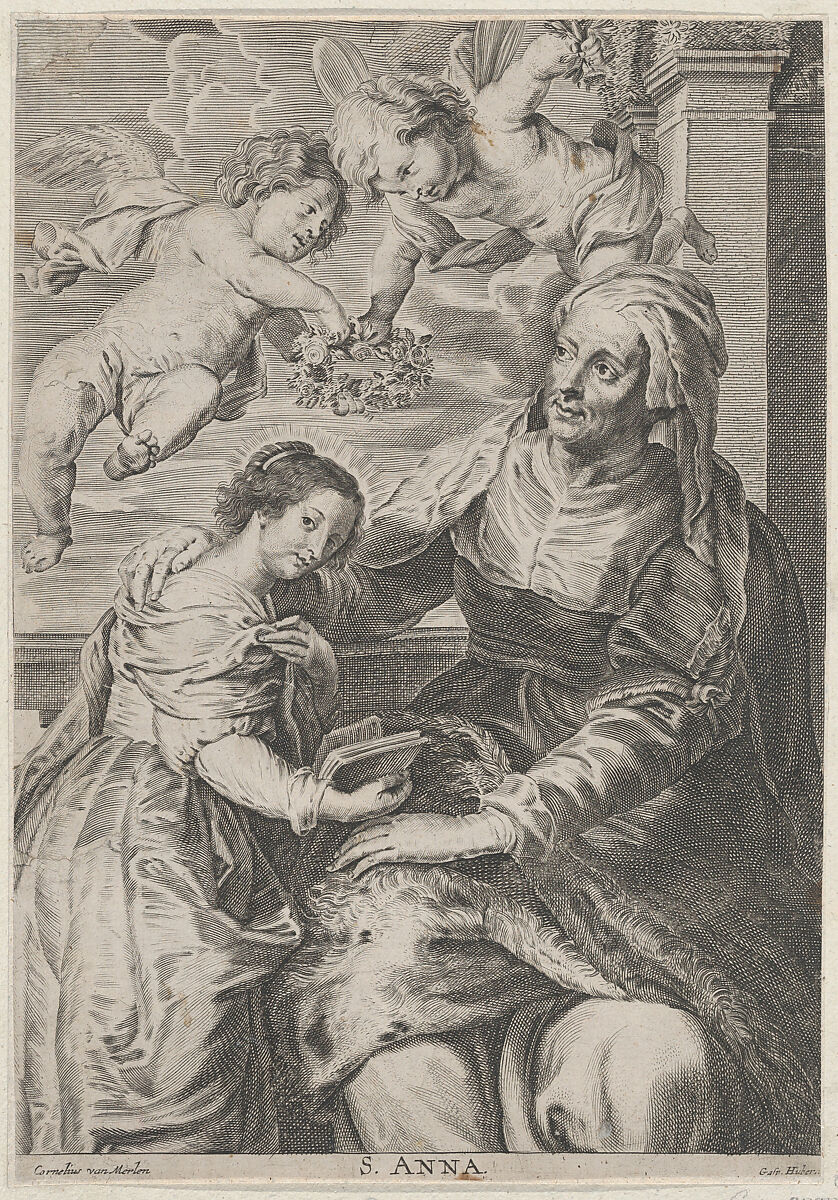 - Title: The education of the Virgin, with Saint Anne and the Virgin Mary reading with two putti overhead and Saint Joachim behind them at left