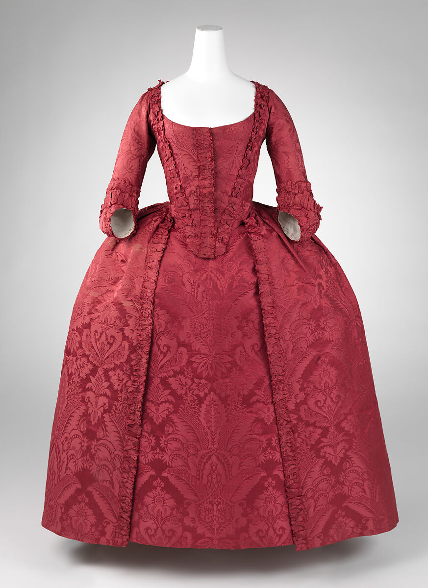 This robe à l’anglaise is a superb expression of the English taste in dress—skillful cut and construction, and free from elaborate trimmings—a sensibility that increasingly influenced European modes of dress in the late eighteenth century. The refined simplicity and neat tailoring associated with English dress grew increasingly influential in France during the latter half of the eighteenth century. By the 1770s, French fashion magazines regularly featured the robe à l’anglaise, praising its elegance and modest charm. This example is impeccably made and discreetly adorned, its sole ornamentation being bands of pinked, self-fabric trim. The choice of textile, a delicately patterned silk damask dating to the 1730s, is evidence of the common eighteenth-century practice of repurposing finely woven fabrics.