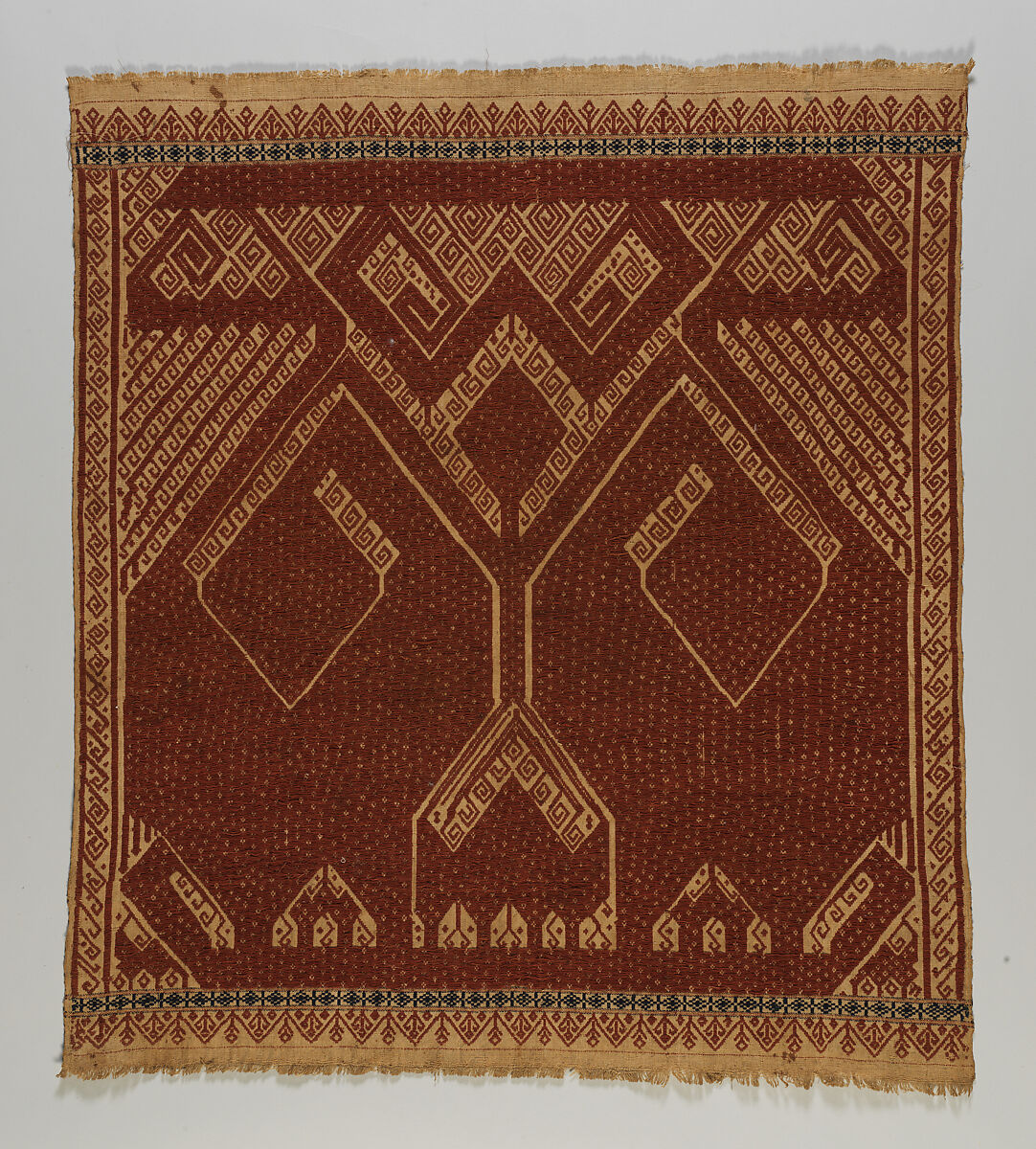Indonesia’s long history of maritime trade and the immense wealth that it brought are embodied in the remarkable textiles of the Lampung region of southern Sumatra. Lampung is situated on the western side of the Sunda Strait between the islands of Java and Sumatra and has been a vital trade route since ancient times. The region is known for its black pepper, which historically was highly valued in the spice trade ad is still produced there today. The cosmopolitan influences resulting from Lampung’s strategic location are evident in its ritual textiles. The two most abundant types are tampan and palepai which incorporate imagery that predominantly depicts stylized ships, outside Indonesia, these are often referred to collectively as ‘ships cloths’. These four high-quality Lampung textiles tampan significantly enhance our holdings in this area, adding important depth to the current collection of textiles from the region. All four of these textiles are in excellent condition, expertly executed in bold red or tan against a natural background, they retain a depth of color that animates their lively designs.