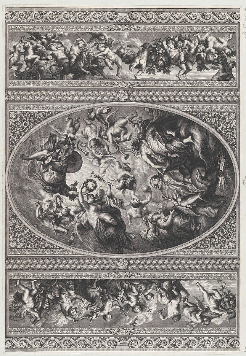 - Title: The apotheosis of James I in an oval at center, friezes with putti and garlands on either side
