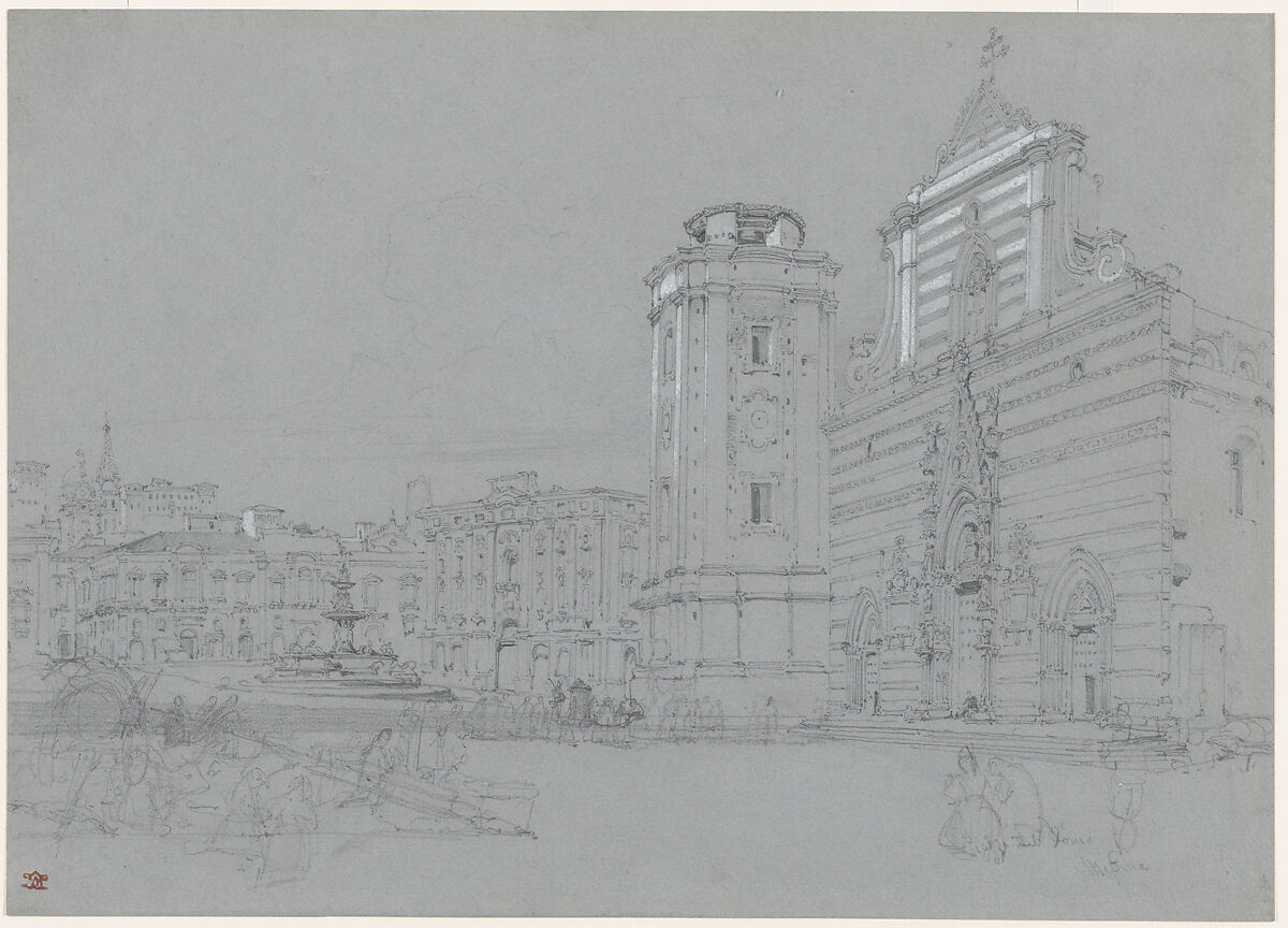 Leitch drew Messina’s main square when he visited the city in 1835-36 during a four-year sojourn in Italy. The distinctive banded façade of the city’s Norman cathedral, and its truncated bell-tower, would both be destroyed in an earthquake of 1908, and later rebuilt. At center, we are shown the fountain of Orion (1553), with Italian pilgrims kneeling in the foreground. After Leitch returned to London in 1837, he became active in the Royal Institute of Painters in Watercolours, and served as drawing master to Queen Victoria and the royal children.