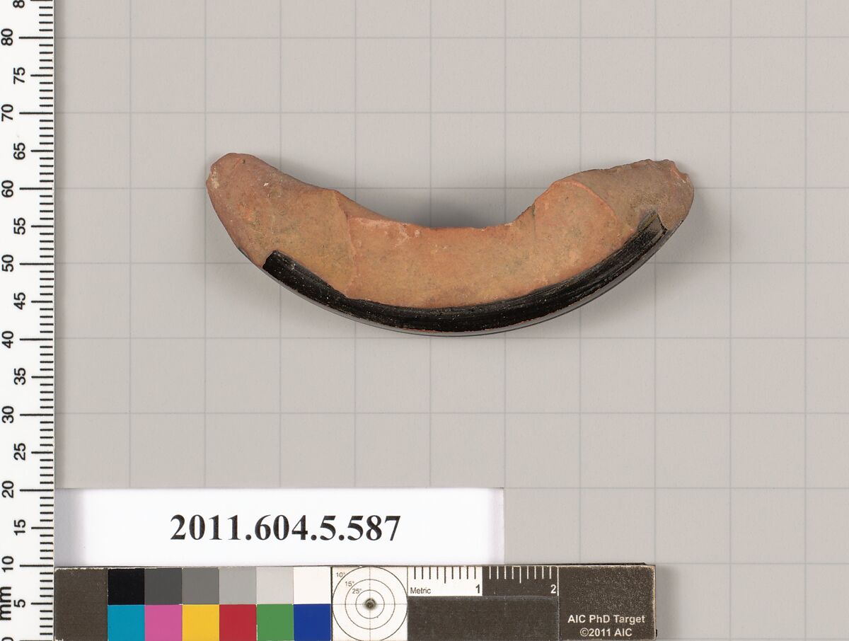 - Title:Terracotta fragment of a stemless kylix (drinking cup)