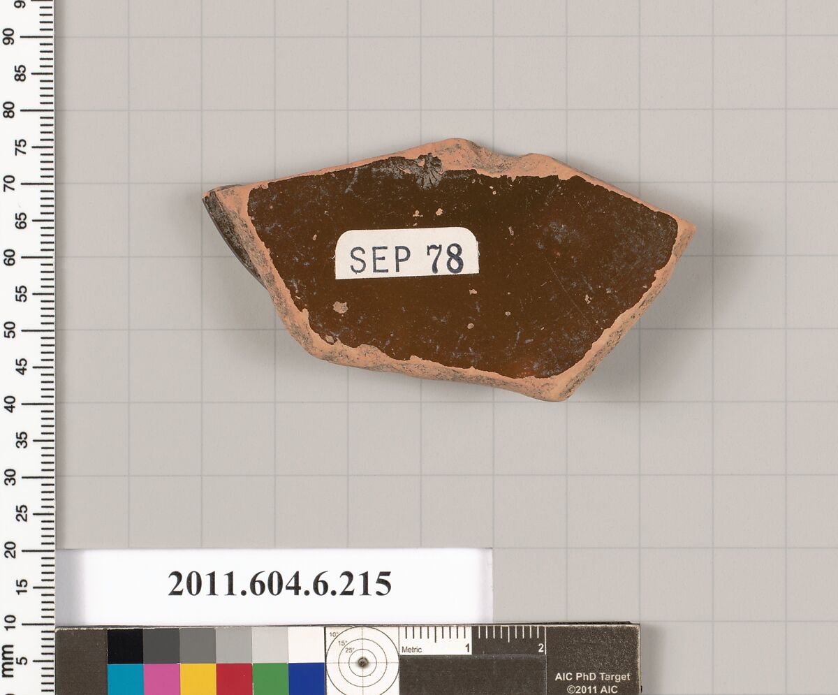 Black glazed fragment from an open shape, with part of the disk foot; the resting surface and inner wall of the foot are glazed; the underside has an outer band of reserve, followed by a band of black glaze, and another band of reserve