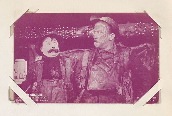 From Scenes from Movies Exhibit Cards series (W404). Distributed by Exhibit Supply Company of Chicago. Postcard-sized thick card. Postcard back. Dispensed in arcade machines.