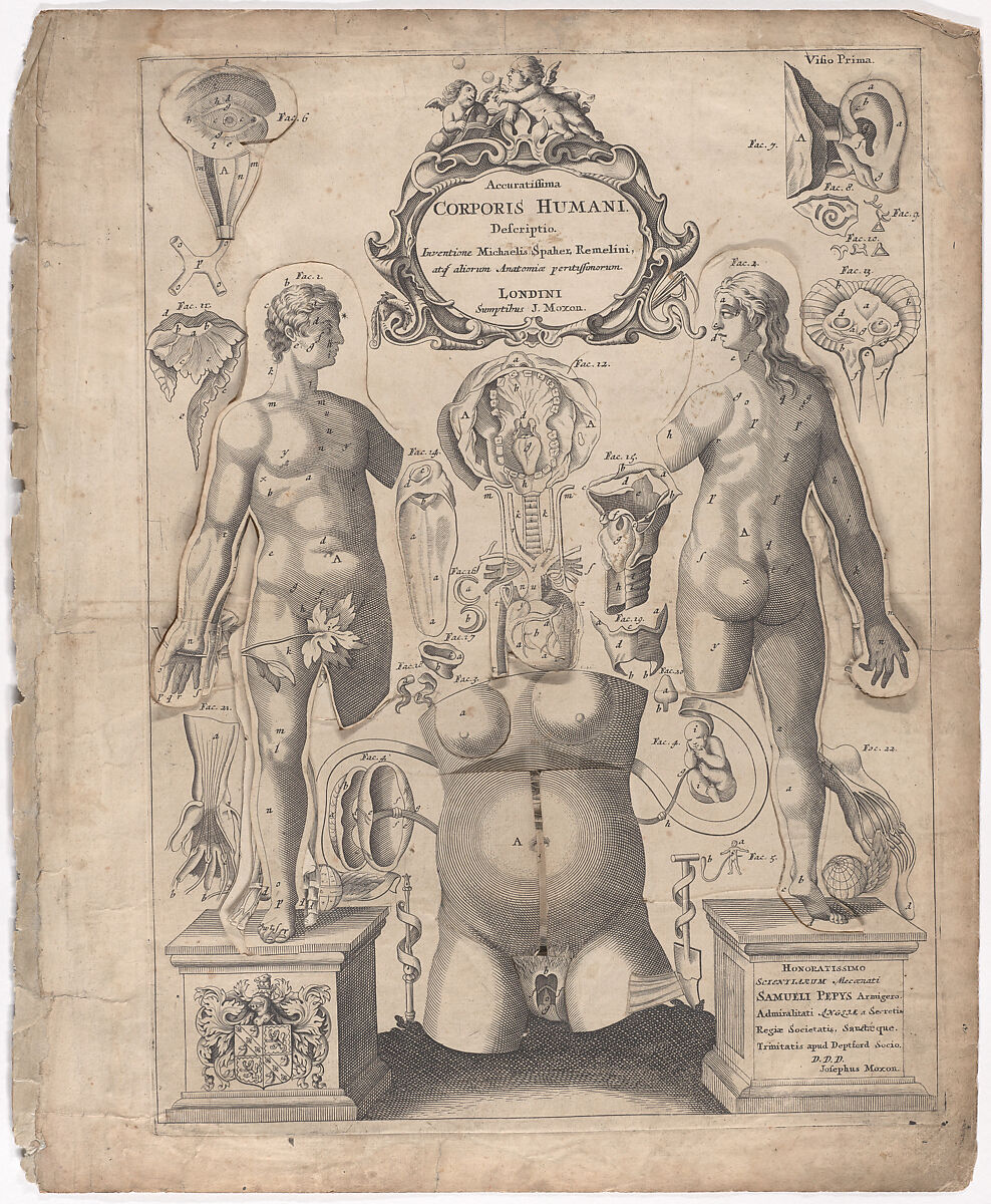 The anatomical image with attached moveable flaps that, when lifted, reveal underlying layers that illustrate the organs, blood vessels, and bones of the human body is a type of print that was produced throughout the sixteenth and seventeeth century. The many different language editions and reeditions testify to the popularity of this genre. The tradition goes back to Strasbourg artist Heinrich Vogtherr’s depiction of a seated woman of 1538 in which a flap on the woman’s belly can be lifted to reveal the organs inside.