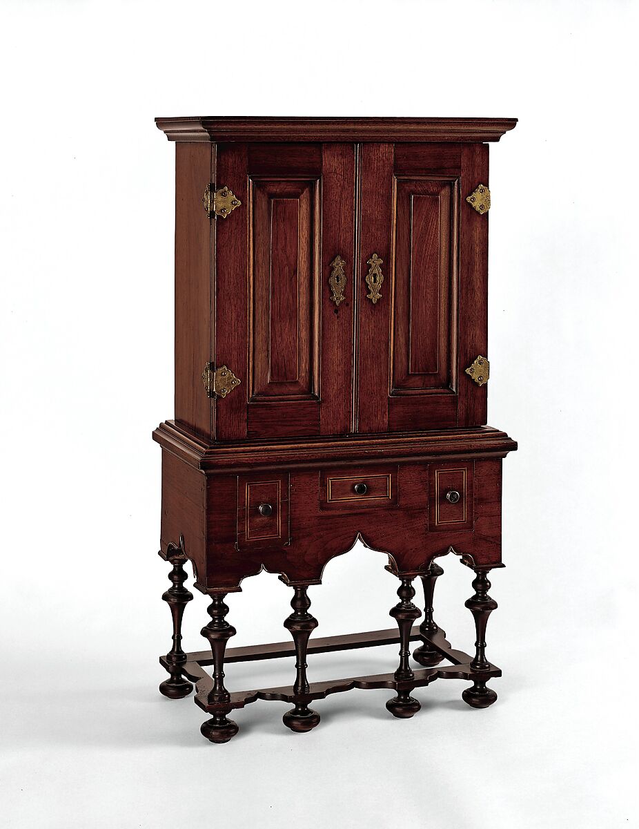 Spice boxes, with their small interior compartments, served the practical purpose of storing and safeguarding valuables and exotic spices. The handsome example of the form mimics the full-scale William and Mary style high chests of drawers seen in this gallery. Its fine craftsmanship, ornate design, and delicate inlay indicate that it was likely placed on display in the parlor or best room in the house.