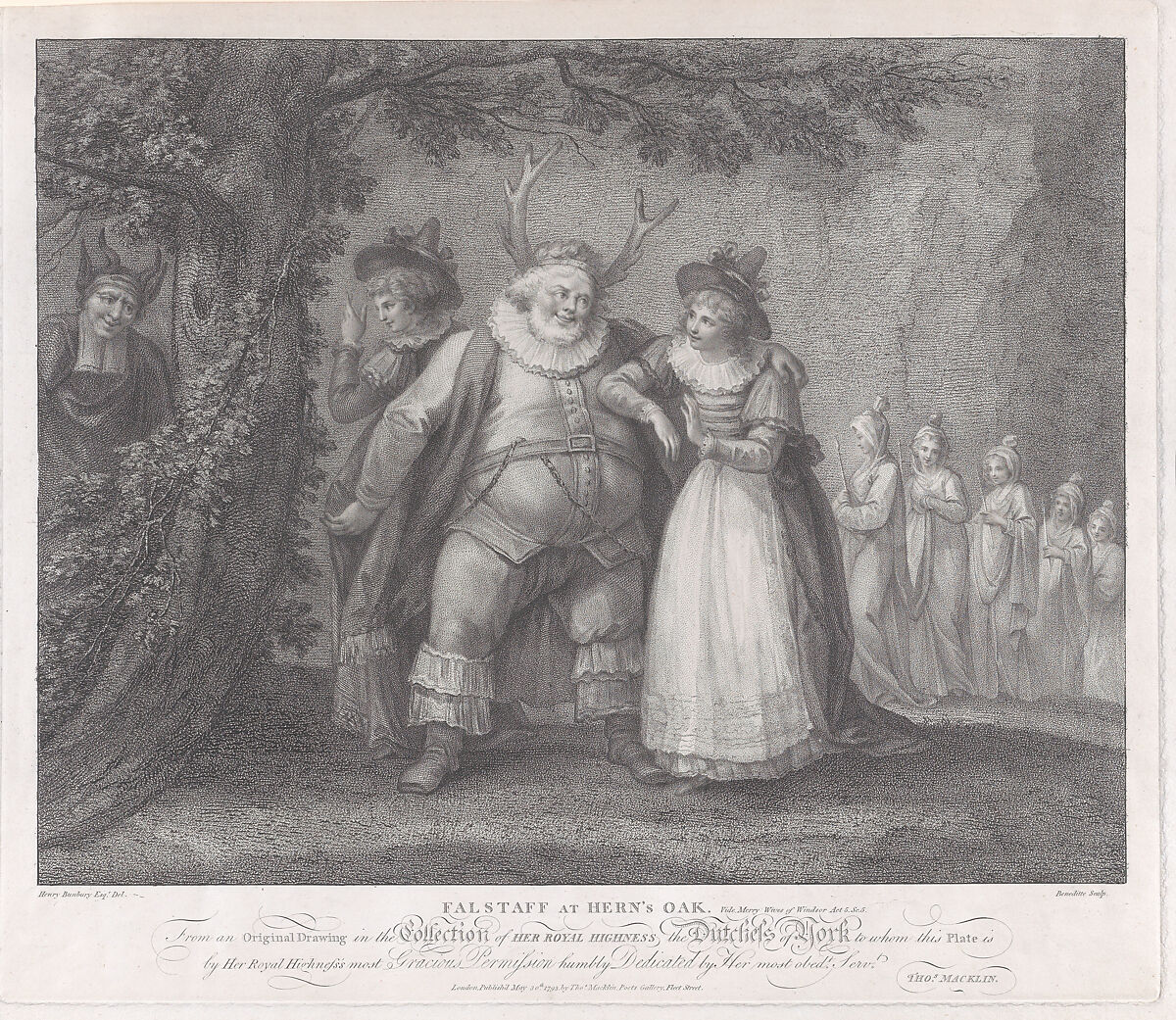 Bunbury's "Shakespeare" consisted of twenty-prints published between 1792 and 1797, issued periodically in sets of four. The publisher Thomas Macklin was inspired by the success of Boydell's Shakespeare Gallery to open a rival Poets Gallery in 1787. He then commissioned a set of large watercolors from Bunbury of comic Shakesperean subjects with related prints issued by subscription. The artist was the younger son in an old gentry family who had amused fellow students with comic drawings at Westminster School in London, then at Cambridge University. He became a friend of Thomas Rowlandson, who etched many Bunbury designs. Most of Bunbury's income came, however, from army positions and the patronage of the Duke of York, whom he served as equerry. The Shakespeare series of watercolors rank among the artist's most ambitious and soon belonged to the Duchess of York. Michele Bennediti, a follower of Francesco Bartolozzi, produced this stipple engraving of a famous scene near the end of "The Merry Wives of Windsor." The housewives Mrs. Ford and Mrs. Page have arranged to meet Falstaff in Windsor Forest at night. He hopes to seduce them, and is unaware of their elaborate scheme to fend off his repeated and unwelcome attentions.