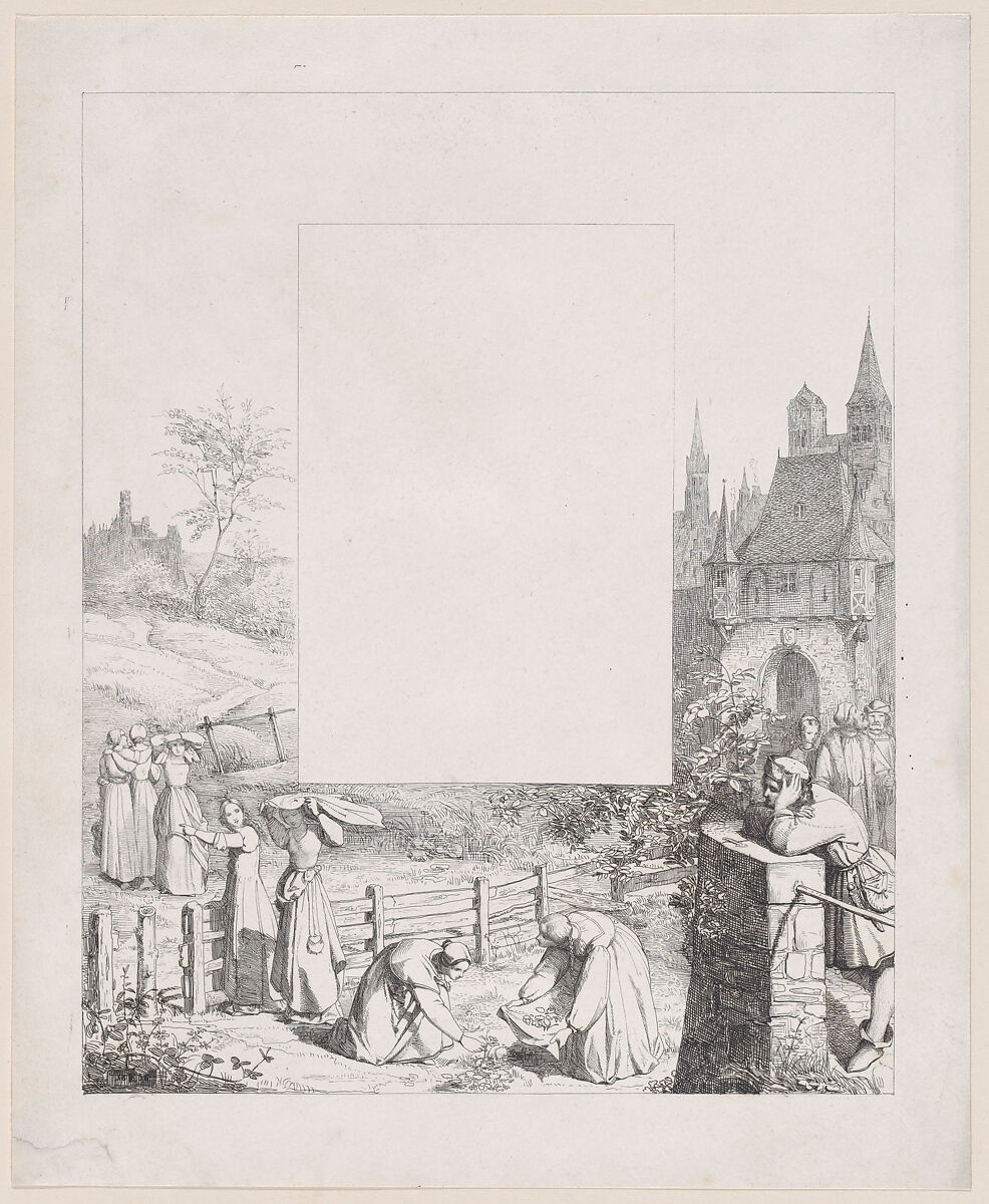 - Title: Plate 5: women collecting plants and carrying them over their heads, a male onlooker at right and a castle at right in the background, from "Lieder eines Malers mit Randzeichnungen seiner Freunde"