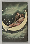 At the height of the picture postcard craze in the early twentieth century, photo studios at beach resorts, state fairs, carnivals, and downtown arcades offered a variety of playful props and backdrops for sitters to pose against. During the same period, there was a resurgence of popular interest in the romance of the Moon, as evidenced in countless Tin Pan Alley songs, such as "Shine On, Harvest Moon" (1908), "By the Light of the Silvery Moon" (1909), and "I’ll Sit Right on the Moon and Keep My Eyes on You" (1912). Given this confluence, it is not surprising that one of the most popular studio props was the "paper moon," a cut-out crescent moon set in front of a backdrop painted with stars and the occasional comet (inspired by the passing of Halley’s comet in 1910). Decades before the first spacecraft were launched into orbit, thousands of individuals commemorated their own imaginary lunar voyages with these charming photographic souvenirs.