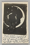 At the height of the picture postcard craze in the early twentieth century, photo studios at beach resorts, state fairs, carnivals, and downtown arcades offered a variety of playful props and backdrops for sitters to pose against. During the same period, there was a resurgence of popular interest in the romance of the Moon, as evidenced in countless Tin Pan Alley songs, such as "Shine On, Harvest Moon" (1908), "By the Light of the Silvery Moon" (1909), and "I’ll Sit Right on the Moon and Keep My Eyes on You" (1912). Given this confluence, it is not surprising that one of the most popular studio props was the "paper moon," a cut-out crescent moon set in front of a backdrop painted with stars and the occasional comet (inspired by the passing of Halley’s comet in 1910). Decades before the first spacecraft were launched into orbit, thousands of individuals commemorated their own imaginary lunar voyages with these charming photographic souvenirs.