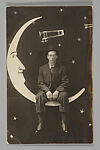 At the height of the picture postcard craze in the early twentieth century, photo studios at beach resorts, state fairs, carnivals, and downtown arcades offered a variety of playful props and backdrops for sitters to pose against. During the same period, there was a resurgence of popular interest in the romance of the Moon, as evidenced in countless Tin Pan Alley songs, such as "Shine On, Harvest Moon" (1908), "By the Light of the Silvery Moon" (1909), and "I’ll Sit Right on the Moon and Keep My Eyes on You" (1912). Given this confluence, it is not surprising that one of the most popular studio props was the "paper moon," a cut-out crescent moon set in front of a backdrop painted with stars and the occasional comet (inspired by the passing of Halley’s comet in 1910). Decades before the first spacecraft were launched into orbit, thousands of individuals commemorated their own imaginary lunar voyages with these charming photographic souvenirs.
