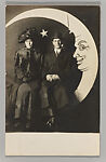 At the height of the picture postcard craze in the early twentieth century, photo studios at beach resorts, state fairs, carnivals, and downtown arcades offered a variety of playful props and backdrops for sitters to pose against. During the same period, there was a resurgence of popular interest in the romance of the Moon, as evidenced in countless Tin Pan Alley songs, such as "Shine On, Harvest Moon" (1908), "By the Light of the Silvery Moon" (1909), and "I’ll Sit Right on the Moon and Keep My Eyes on You" (1912). Given this confluence, it is not surprising that one of the most popular studio props was the "paper moon," a cut-out crescent moon set in front of a backdrop painted with stars and the occasional comet (inspired by the passing of Halley’s comet in 1910). Decades before the first spacecraft were launched into orbit, thousands of individuals commemorated their own imaginary lunar voyages with these charming photographic souvenirs.