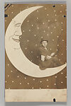 At the height of the picture postcard craze in the early twentieth century, photo studios at beach resorts, state fairs, carnivals, and downtown arcades offered a variety of playful props and backdrops for sitters to pose against. During the same period, there was a resurgence of popular interest in the romance of the Moon, as evidenced in countless Tin Pan Alley songs, such as "Shine On, Harvest Moon" (1908), "By the Light of the Silvery Moon" (1909), and "I’ll Sit Right on the Moon and Keep My Eyes on You" (1912). Given this confluence, it is not surprising that one of the most popular studio props was the "paper moon," a cut-out crescent moon set in front of a backdrop painted with stars and the occasional comet (inspired by the passing of Halley’s comet in 1910). Decades before the first spacecraft were launched into orbit, thousands of individuals commemorated their own imaginary lunar voyages with these charming photographic souvenirs.