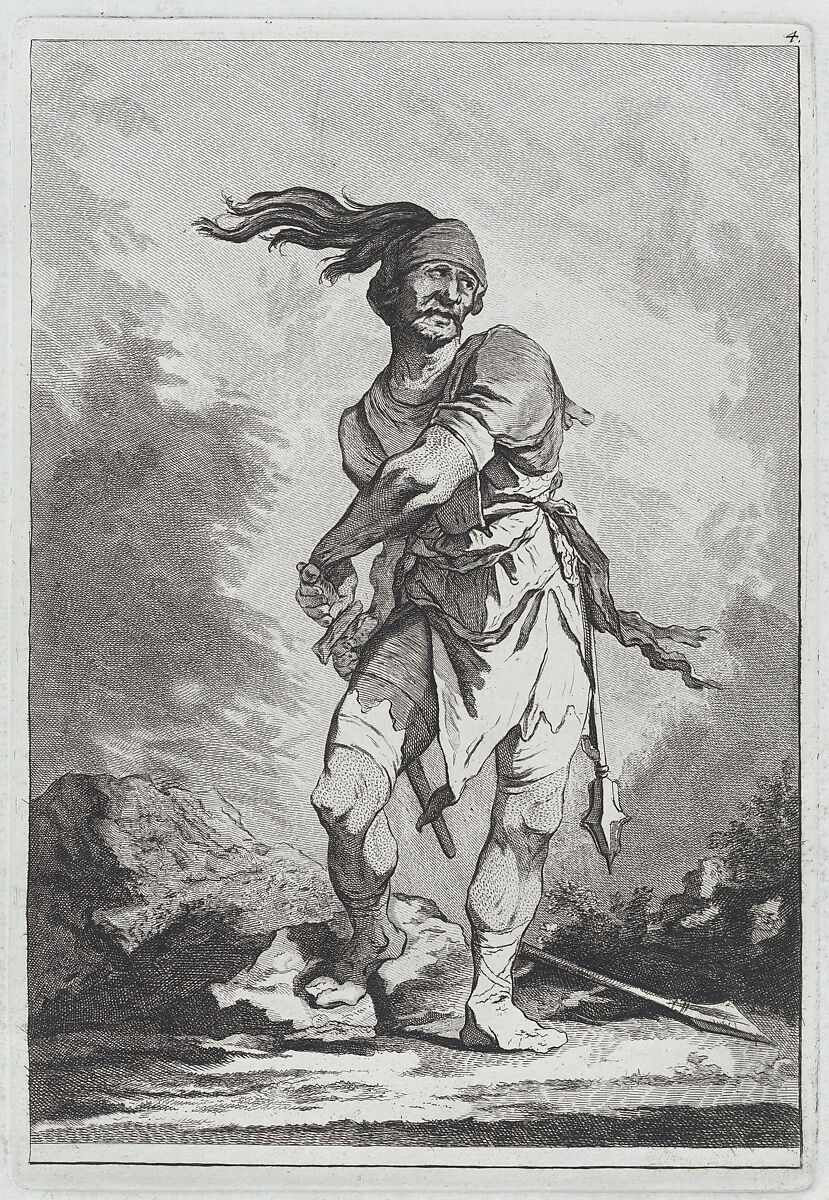 This print comes from a set of "Eight Studies of Soldiers" (2018.54.1-.8) designed by Loutherbourg during his Paris years, 1755–71. While himself an accomplished printmaker, Loutherbourg here turned the etching over to the Zurich-born Matthias Pfenninger, then studying in Paris. The images demonstrate admiration for the Italian 17th-century printmaker, Salvator Rosa.