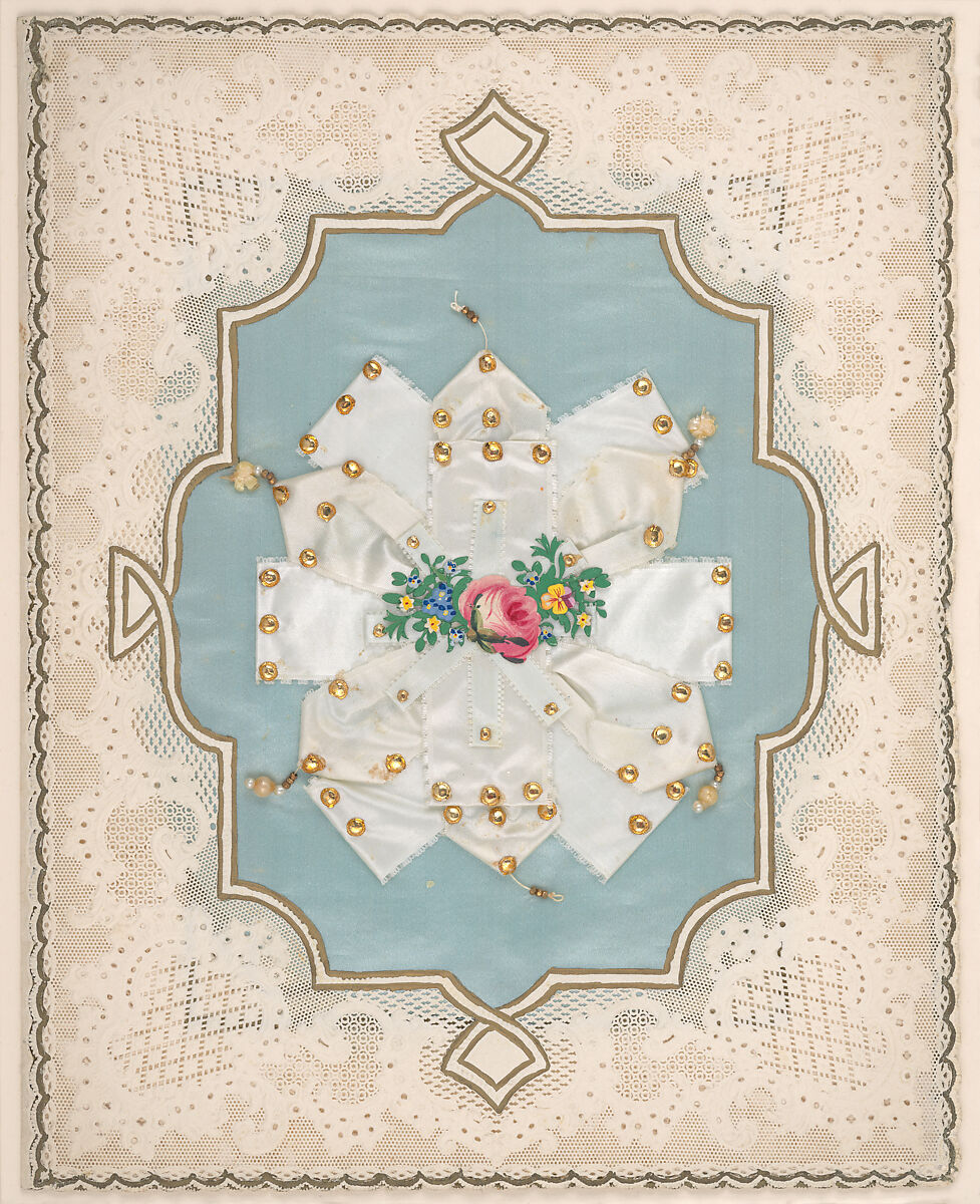 - Medium:Cameo-embossed lace paper, chromolithographed die-cuts, faux pearls, blue satin, white satin ribbon, gold paper stars, graphite, ink, watercolor