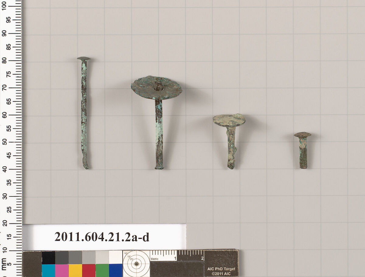 Four fragments of bronze nails; one nail has a round disk attached to it