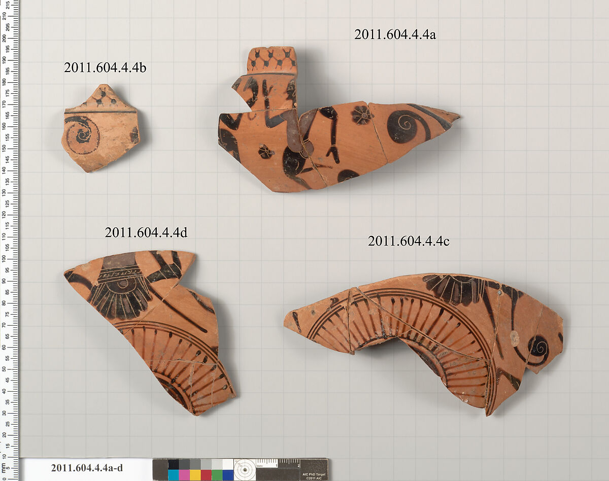 a: the largest fragment, has at the rim, a dot net pattern; below, on the wall of the cup, part of the head, genitals, and bent left leg of a komast to right, holding a drinking horn, facing a second komast; part of the tendrils from the handle ornament; in the background, rosettes; b: at the rim, a dot net pattern; below, on the wall of the cup, part of a tendril from the handle ornament; at the right, part of a rosette; c: at the bottom left, feet of a komast to left; part of the palmette and tendril from the handle ornament; part of the right calf and foot of a komast to right; below, three black glazed lines and a band of rays; d: part of the palmette and tendril from the handle ornament; at the far right, heel of a komast to right; below, three black glazed lines and a band of rays