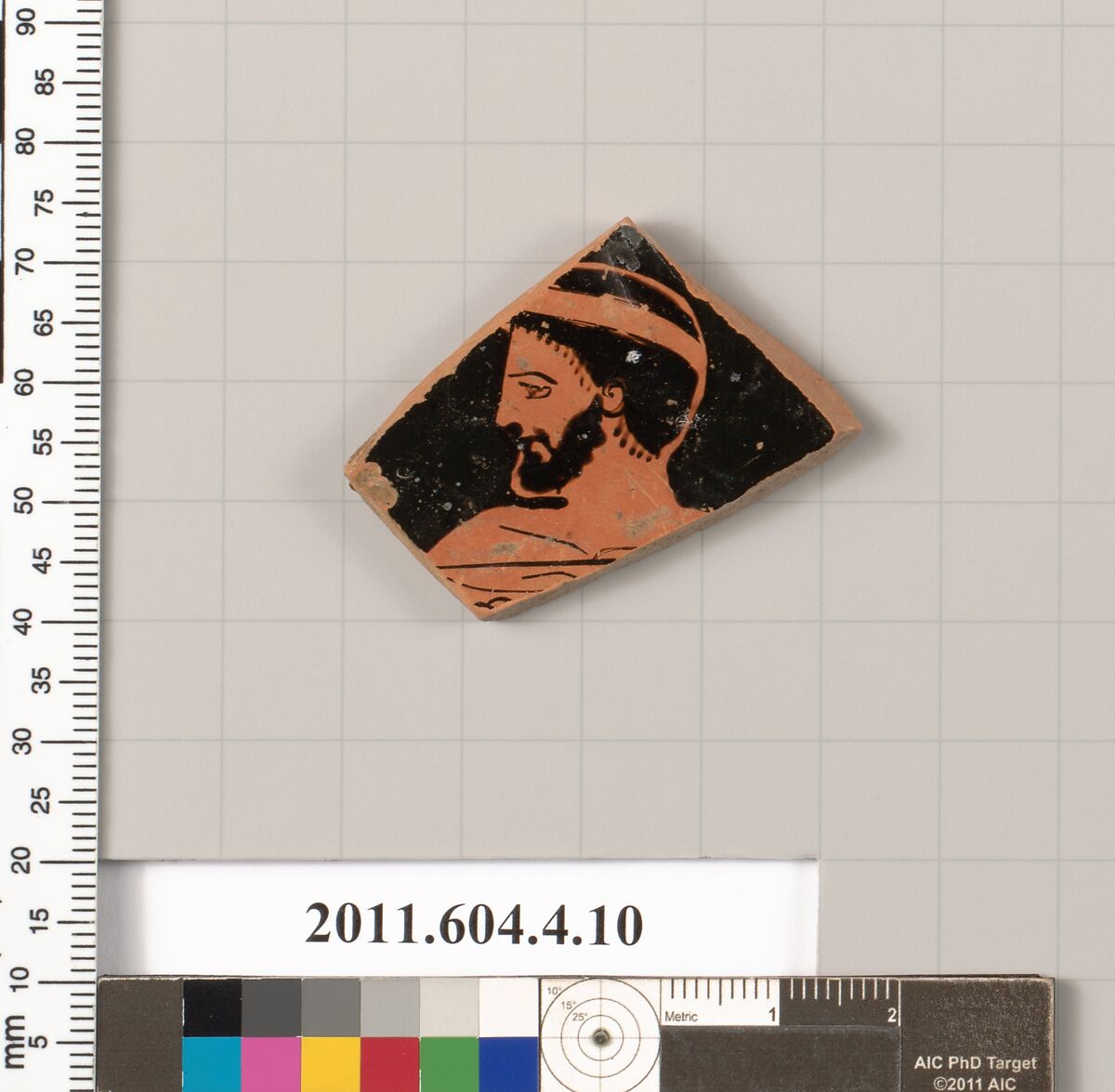 Interior, head, neck, and right shoulder of a bearded man looking to left, holding a kylix; Exterior, lower drapery of a woman to right; below, parts of two reserved lines