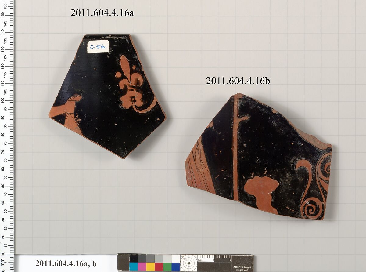a: the rim fragment has a right hand holding a bag, and a lotus bud and tendril from the handle ornament; near the break, above the right arm, one letter of an inscription, L?; b: tendrils from the handle ornament; lower part of a draped male to left, with a staff; in between the tendril and staff, an unidentified object