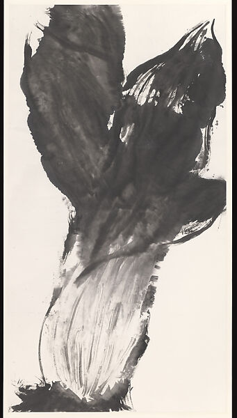 This is an image of the humble Chinese cabbage (bok choy or bai cai) magnified to heroic scale, some six feet tall. The tips of the leaves were painted in broad, gestural lines of wet, black ink that has bled in an uncontrolled manner into the absorbent xuan paper, leaving both the original line and a penumbra of saturation around it. To this, the artist has added wet washes of dark ink that have mottled and pooled irregularly on the surface of the leaves. The white base of the vegetable has been left mostly in reserve, with a moderate amount of light side-brush texturing. The roots of the bok choy, still attached, are rendered in dark washes of ink. The painting has been backed with several layers of xuan paper and mounted to a wooden frame.