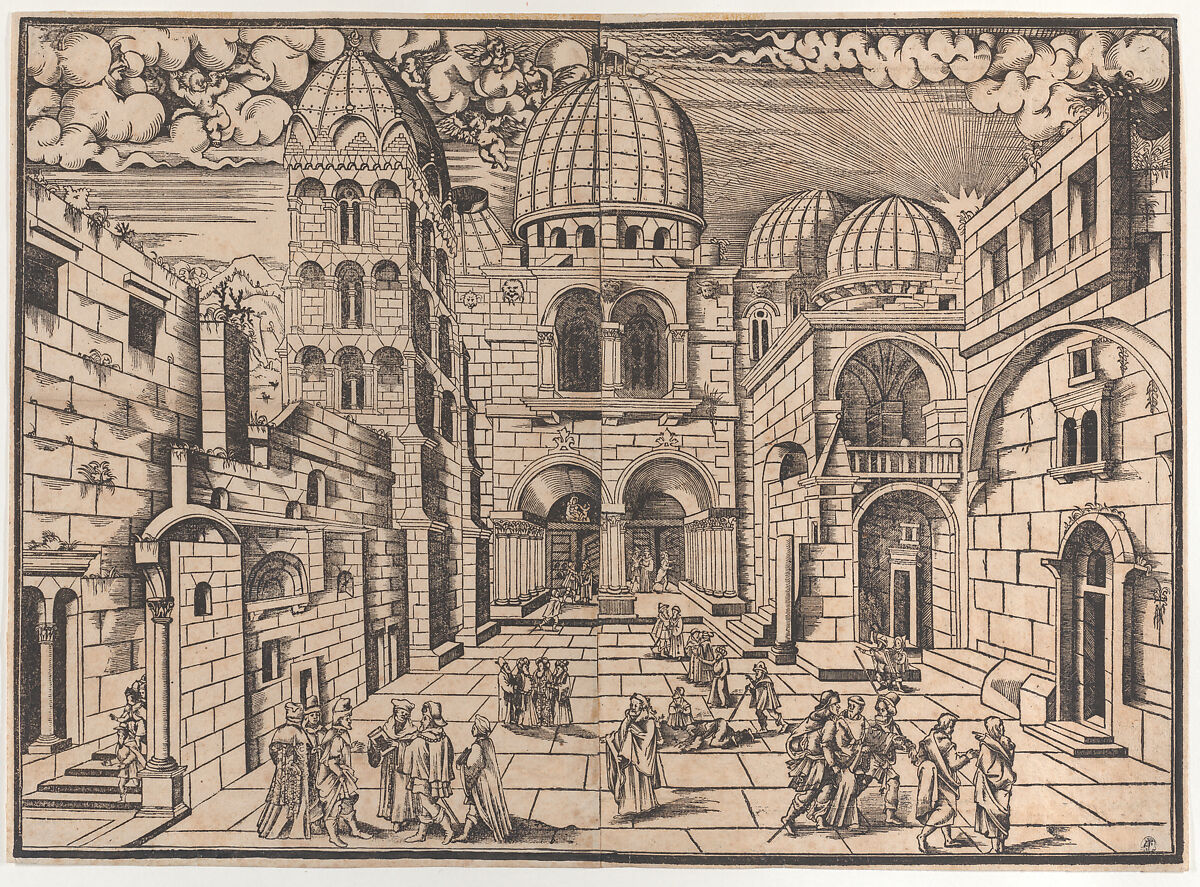 The print is on two joined sheets and depicts the church of the Holy Sepulchre Jerusalem and its surrounding architectural complex. Various figures fill the foreground: scholars, merchant, pilgrims and soldiers. The print is closely related to another woodcut of the same subject and of similar size, an impression of which can be found in the British Museum (1935,0713.6). That print has the date 1546 in a cartouche providing an approximate date for the present print. Dalle Greche was a Woodcutter and publisher who worked in Venice in the 1540s. He is best known as the publisher of the 1549 edition of Titian's 12-block woodcut of the Drowning of Pharaoh's Army in the Red Sea (see 22.73.3.131–138). The print is a striking example of sort of large-scale print that were produced in Venice in the sixteenth century and for which the city was justly famous.
