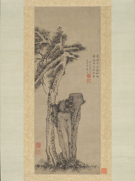 Pine and rock are paired to create a quiet but sturdy image of constancy and persistence. This painting was created by the celebrated scholar-artist Wen Zhengming and later inscribed by his son Wen Jia with an eleventh-century poem about pine trees. Pines were a common subject for birthday-gift paintings; the elder Wen may have painted this one in advance and never found the occasion to inscribe it for a recipient.
