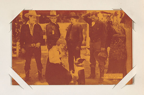 From Western Stars or Scenes Exhibit Cards series (W412). Distributed by Exhibit Supply Company of Chicago, Mutoscope or other companies. Dispensed in arcade machines. Postcard-sized thick card. Color toned.