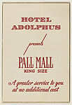 - Title: Hotel Adolphus presents Pall Mall King Size, from the "Hotel Greeting Cards" series (T71), issued by R. J. Reynolds Tobacco Company