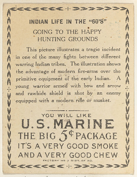 - Title: Going to the Happy Hunting Grounds, from the "Indian Life in the 60's" series (T73), issued with Hassan Cork Tip Cigarettes by the American Tobacco Company