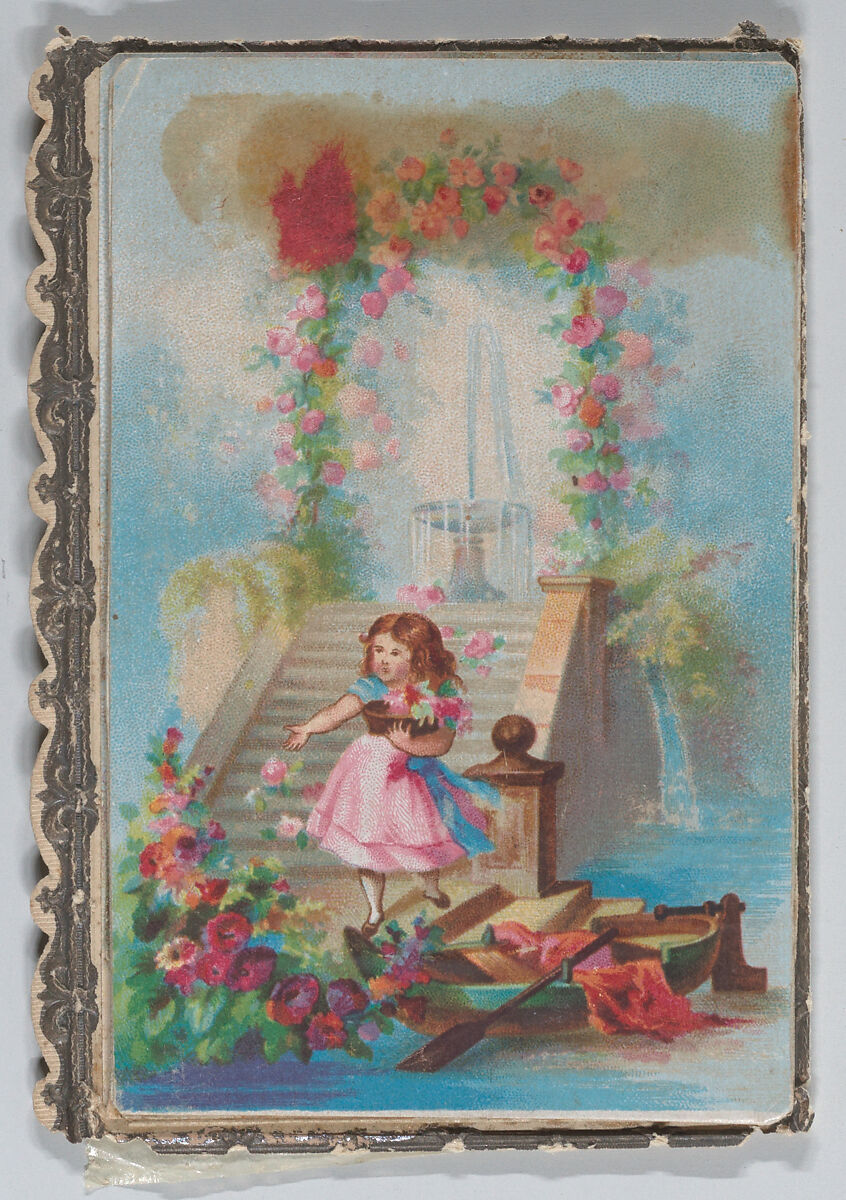 - Medium:Heavy card-stock, die-cut scraps, chromolithography, white ribbon