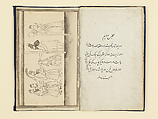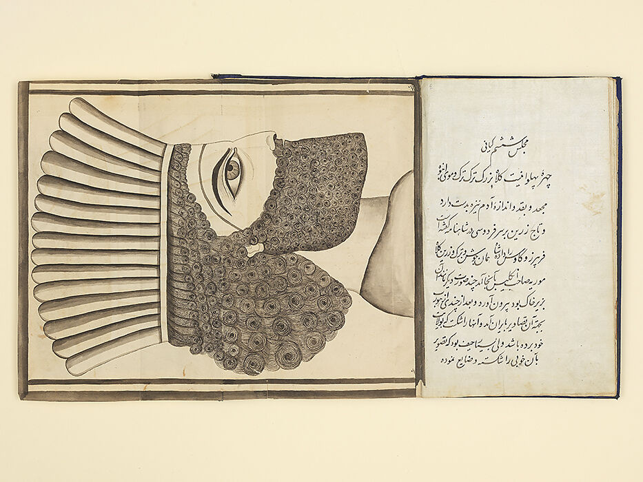 The illustrations in the manuscript are characterized by Ahmad’s bold and precise hand. While all of the ancient monuments he draws are clearly identifiable, some of the images show inventiveness or misunderstanding on his part. For example, in rendering the reliefs of the Persian king as a hero fighting a horned griffin that adorn many doorjambs at Persepolis, he has drawn the creature’s horn as hair. Moreover, rather than drawing damaged parts of reliefs he leaves them blank, contributing an eerie quality to some of his pictures.