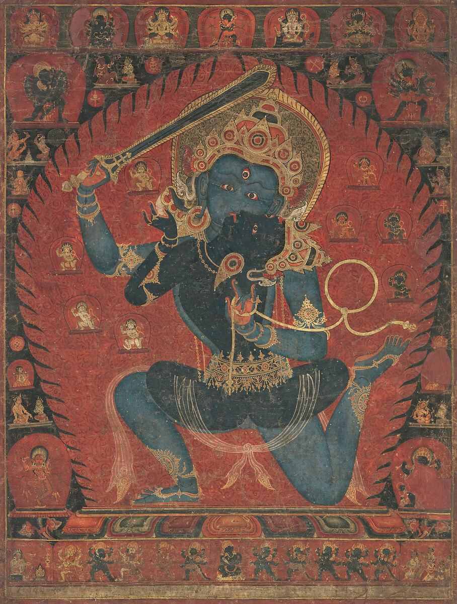 Acala (literally, “immovable”) is a wrathful manifestation of Manjushri, the bodhisattva of supreme wisdom, and, in Nepalese Buddhism, a manifestation of Chakrasamvara. He is popularly associated with magic, healing, and protection from disease. This painting is a visualization of the Chandamaharoshana Tantra, the meditational text devoted to Acala. With its intense colors, dynamic postures, and imposing scale, it ranks among the most powerful examples of sixteenth-century Nepalese painting. Crowned, jeweled, and wielding his sword, Acala cuts through the veil of ignorance. In his left hand he holds a vajra-tipped noose to catch the ignorant, while also gesturing in admonition. He is locked in sexual embrace with his consort, Vishvavajri. The pair visually expresses the bliss of enlightenment that can be achieved by the combination of wisdom and compassion.