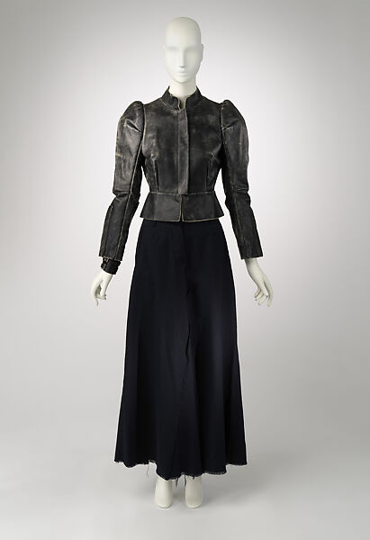 This leather jacket made from used vintage leather was shown as part of an outfit in the fall/winter 1989–90 collection by Maison Martin Margiela, known for its use of discarded fabrics and repurposing of vintage garments. This was the second collection by the French label under the direction of Belgian designer Martin Margiela. The narrow, elongated silhouette with Victorian shoulders was a huge shift from the typical broad-shouldered 1980s silhouette and prefigured the new slim and deconstructed silhouette for the final decade of the twentieth century. It also referenced the fin de siècle silhouette of a century earlier, thus connecting different fashionable eras through construction and pattern. Margiela kept on redesigning shoulders over the course of his career, ending with wide and conical shapes. The shoulder was an important structural element for his designs, rather than the waist or bust.