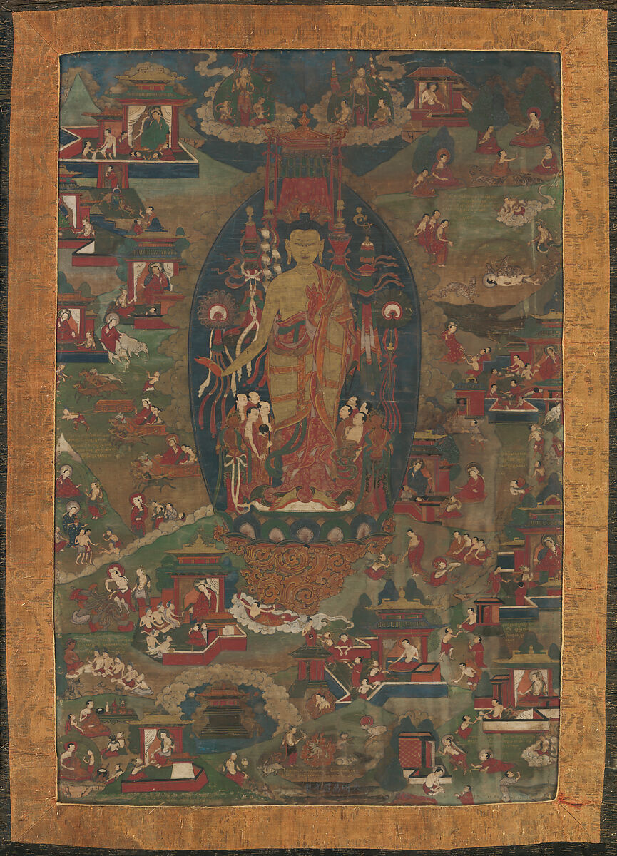 This painting depicts a rare subject in Tibetan art, the life of Buddha Shakyamuni and his previous incarnations as told in the Jataka tales. These stories form an essential component of the Buddhist cosmology. Two Jatakas recount the central teaching of bodhisattva’s self-sacrifice: Sibi Jataka in which the bodhisattva cut off his own flesh to feed the hungry, and the tale of Prince Sattva, who committed suicide in order to gift his body to a tigress so she could feed her starving cubs. This thangka has a Chinese inscription dating the work to the reign of the Ming Emperor Wanli (r. 1573–1619), as well as Tibetan glosses identifying the scenes depicted. The presence of the Tibetan inscriptions indicates that this thangka was made for a Tibetan client. Depicted around the central icon of a radiant Buddha are the narratives, each with mountains and monastic buildings serving as scene dividers.