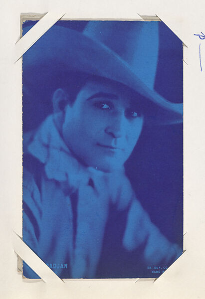 From Western Stars or Scenes Exhibit Cards series (W412). Distributed by Exhibit Supply Company of Chicago. Dispensed in arcade machines. Postcard-sized thick card. Blue toned.