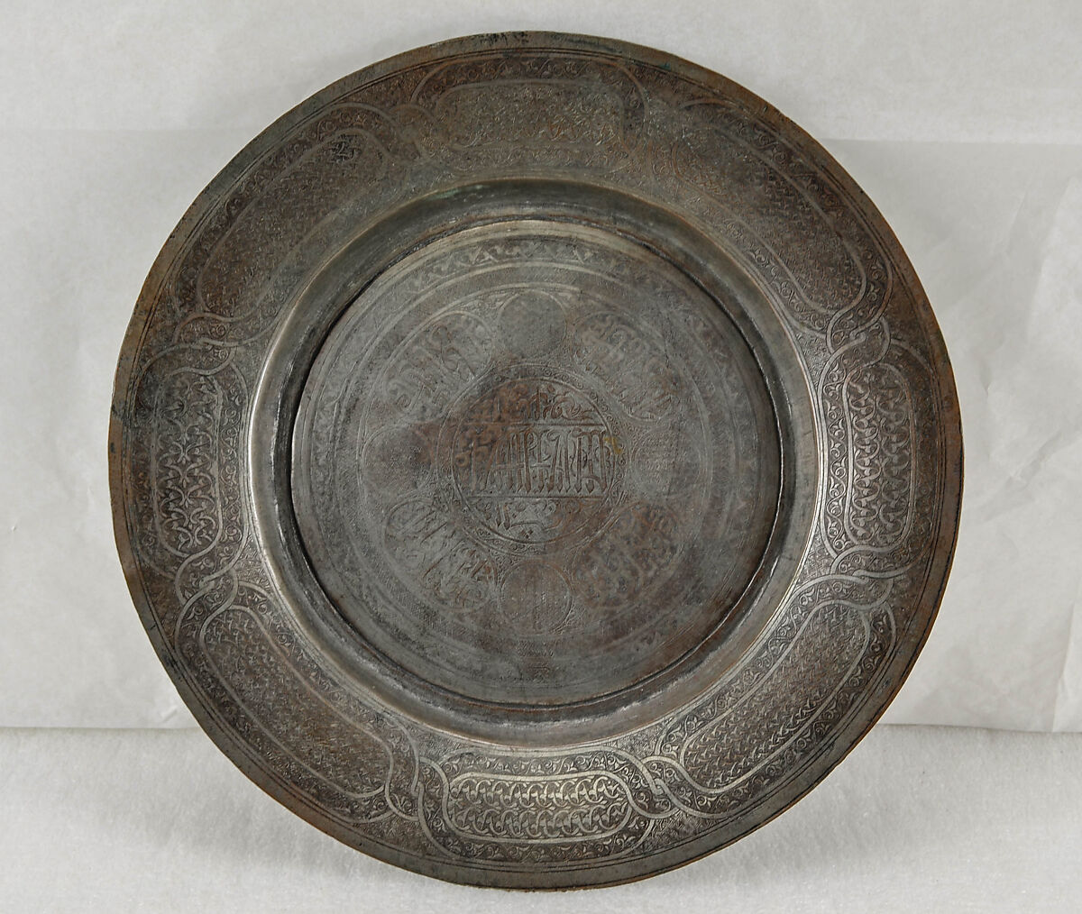 This dish is among the rare examples of tinned copper ware that can be dated securely to the early 15th century, and that was made for a ruler, here named in the epigraphic blazon in the center: Sultan al-Mu’ayyad Shaikh (r. 1412–1421). Besides its historical importance, this plate stands out for its fine engraving with which the artist, who signed his work "the humble Tatar," executed the decorative repertoire, including epigraphic and vegetal cartouches and bands filled with scrolling and interlacing split-palmettes.