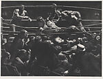 Prizefighting was highly popular in the U.S. during the first decades of the twentieth century and a recurring subject in Riggs’s oeuvre. Here, Riggs captured a moment of tension during the 1934 world heavyweight championship at the short-lived Madison Square Garden Bowl (1932–42) in Long Island City, Queens, during which Max Baer defeated Primo Carnera for the title. Riggs treated the boxing ring like a dramatically lit stage set, which he achieved through his unusual method of printmaking. To create his lithographs, Riggs applied a subtractive method, working from dark to light rather than the other way around, drawing on a limestone surface with a black lithographic crayon and removing the grease by rubbing the surface or scraping it with a razor blade.