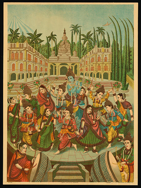 In this festive scene, the flute-playing Krishna is seen presiding over devotees who perform the Dandiya Raas, a dance typical of western India during which the performers strike wooden sticks. The couples, in dress characteristic of the Marathas of Maharashtra, dance in a circle around Krishna, who is standing on a blue lotus bloom. This setting evokes the Raslila dance between Krishna and the milkmaids (gopis), as described in the Bhagavata Purana and the Gita Govinda, key texts devoted to celebrating the youthful Krishna. The stagelike setting is flanked by drummers beating time on large kettledrums. Beyond is a palatial avenue of houses and a temple at the apex, all rendered in dramatic linear perspective.