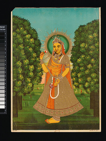 Radha, with peacock feathers in her headdress indicating her devotion to Krishna, stands in a wooded landscape, typically intended to evoke an imminent rendezous with her beloved. The bell shape of her gilded skirt recalls Rajasthani painting of Jaipur in the 18th and 19th centuries. This is also echoed in the sunset and the distinct highlighted leaves of the trees.