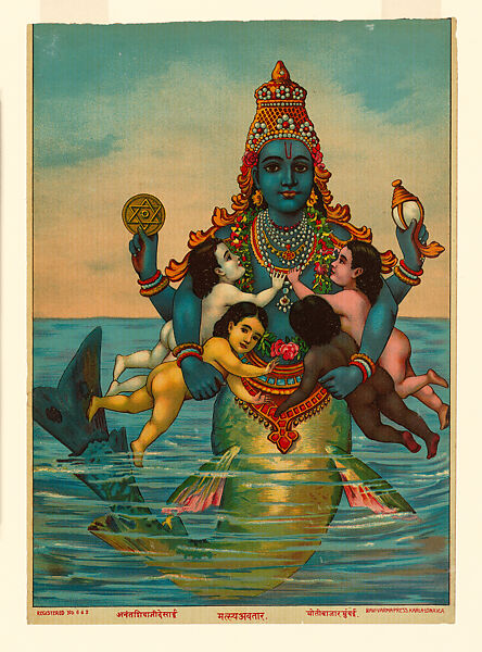 Inexpensive prints of Hindu gods became widely available in late nineteenth-century India as a direct result of the introduction of lithography presses. This new technology was intended to serve the colonial administration and aid the propagation of Christianity by missionary organizations, but it was quickly deployed to create a new form of popular Hindu devotional art. Here we see Vishnu’s first avatar, his fish incarnation, embracing four joyful infants, evoking his role as savior of primeval man (Manu) from the Great Flood. The number four alludes to the Four Vedas, India’s vast corpus of ancient divine knowledge, which Vishnu rescues from the deluge.