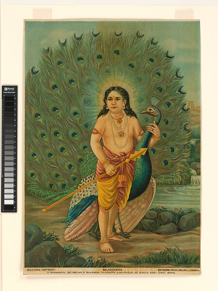 Skanda, the Hindu god of war, is worshipped under many names, as Kartikeya and Kumara especially in northern India, and as Murugan and Subramanyan in the south. The oldest son of Shiva and Parvati, he is nonetheless often depicted as a child, as here. He holds a golden spear and is attended by his mount, the peacock, whose radiant tail feathers frame him in a glorious nimbus. Variants of this print were produced for devotees visiting the many sites sacred to Skanda, especially in Tamil Nadu. One such shrine is depicted at upper right, which may be the hilltop temple of Palani.