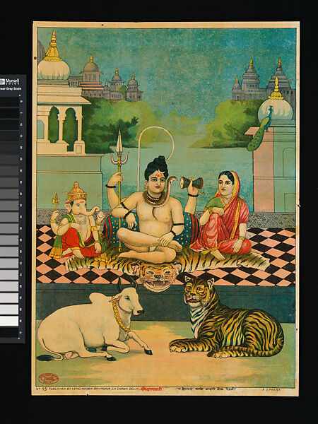 Shiva, Parvati and Ganesha sit on a tiger skin on a terrace before a lake. Below is Nandi, Shiva’s and Parvati’s vahana, here as a tiger rather than the lion usually associated with Parvati. The architecture seen in the background is Rajasthani in character, with the city and lakes of Udaipur being a likely source; similar architectural motifs pervade earlier Rajput painting.