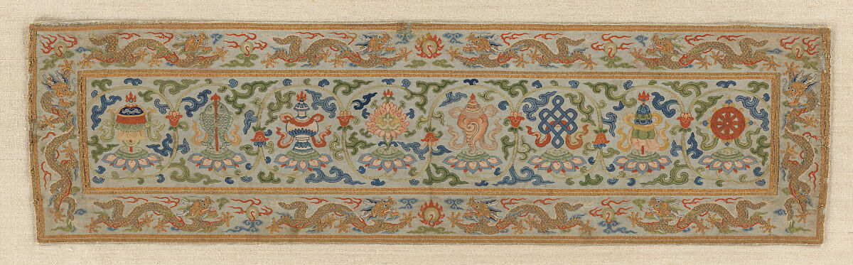 Woven in the delicate kesi tapestry technique, this horizontal panel features a group of Eight Auspicious Emblems (umbrella, double fish, vase, flower, conch shell, endless knot, canopy, and wheel) that were initially introduced to China with Buddhism, and later became traditional motifs in the decorative arts. Each emblem rests on a lotus flower, and each has decorative ribbons fluttering to either side. An additional Buddhist symbol, a flaming jewel, crowns many of the eight, and a vegetal scroll serves to link the lotuses that support the eight treasures. A series of prowling five-clawed dragons fills the borders of the panels.