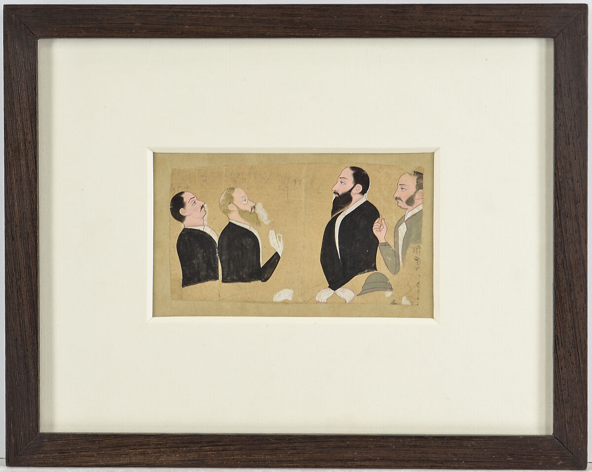 Typically, British officers were interested in depictions of the flora and fauna of India, but in other cases, artists experimented with portrayals of the Europeans themselves. This unfinished drawing is most likely a portrait depicting four real individuals. Although they are probably identified in the illegible Devangari inscription at upper left, their identities have been lost to time.